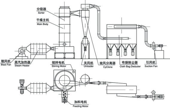 经换热器加热后的洁净空气被鼓入进风口,以适宜的速度旋入干燥室底部的环隙,然后按切线方向进入干燥室,并呈螺旋状上升:同时,物料则由可无级调速的加料器定量加入塔内。在干燥塔内,物料与热空气进行充分、高效的质热变换,被干燥的粉状物料随同热风一起输送至分离器,其中成品收集包装,而尾气则进一步经除尘装置处理后排空。