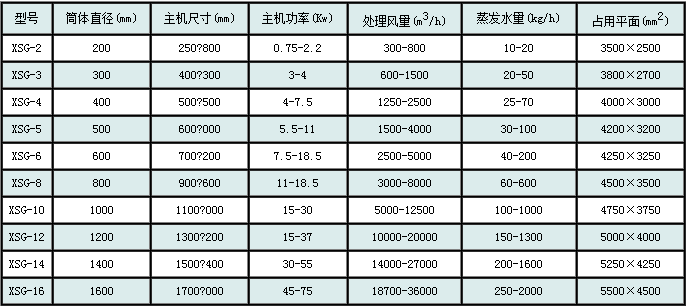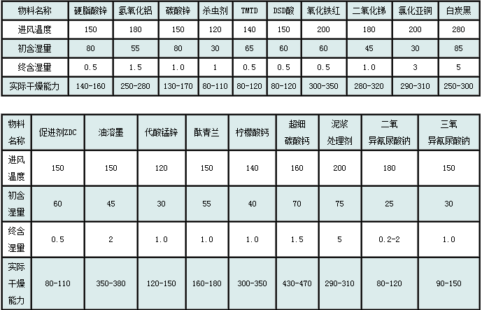 注:1.水分蒸发量是以进风温度为180℃、出风温度为80℃时每小时蒸发的水分。