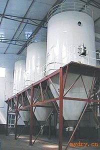 空气经过滤和加热,进入干燥器顶部空气分配器,热空气呈螺旋状均匀地进入干燥室。料液经塔体顶部的高速离心雾化器,(旋转)喷雾成极细微的雾状液珠,与热空气并流接触在极短的时间内可干燥为成品。成品连续地由干燥塔底部和旋风分离器中输出,废气由风机排空。